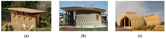 Different support systems for the roofs of 3 D-printed houses with earthen materials: (a) The roof resting on the perimeter walls of Tova [24]; (b) The roof resting on internal wooden poles of Gaia [25]; (c) The roof of the global approach of Tecla [26].