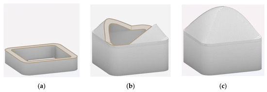 Printing strategies for the walls and roof of the functional module: (a) Printing the walls on horizontal layers; (b) Printing the roofs on 45° inclined layers along the module’s diagonal; (c) Completed module.
