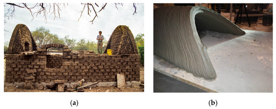 The Nubian vault: (a) Traditional Nubian vault construction technique using raw earth bricks [27]; (b) Prototype of a vault 3D-printed with 40° inclined layers without supports [28].