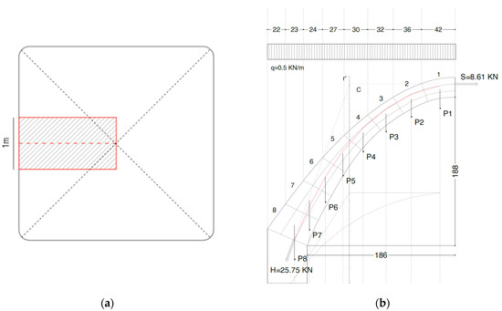 The verification of the pressure curve was carried out using a graphical method, considering the midline of the vault in its vertical plane (Figure 5a). This midline was divided into 8 fictitious arches of 1 m in length, for which the weights of the respective vault segments were calculated (Table 3). The weight vectors were applied to the centroids of the vault segments, which belong to the previously defined arches. Then, the force line was drawn (the line where the sum of the forces are applied) and the funicular polygon was constructed. To comply with the graphic rules for finding the resultant vector between incident vectors of the plane, the line of force—which is a vertical line—passes through the intersection point between the first and last sides of the polygon (Figure 5b). At this point, the line orthogonal to the key section applied into the upper third intersects the line r’ at a point C, giving us the line of action of the horizontal force. The line connecting the pole C and the lower-third middle part of the section at the impost gives us the line of action of the load at the impost. The line of forces has been decomposed according to the horizontal direction and the direction of the line of action at the impost. In this way, it was possible to derive the value of the horizontal force (S) at the keystone and the value of the total load (H) at the impost. Using point C as the projection pole, the pressure polygon was traced and its containment within the middle third of the arch was verified.