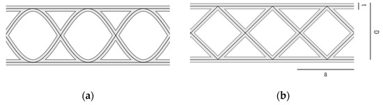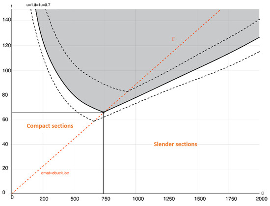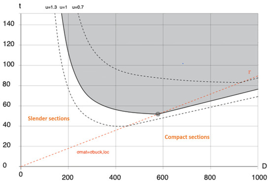 For the evaluation of the mechanical compressive strength of the wall, the simplified resistant section (Figure 7b) was studied. We need the geometric characteristics of the section: Area (A) and Moment of Inertia (I). These quantities are studied on the simplified section (Figure 7b), dependent on the two parameters (D) and (t). For the evaluation of these characteristics, a wall section with a length (L) of 1000 mm and a height (H) of 2200 mm was studied.