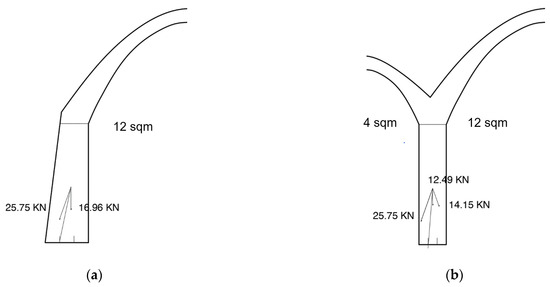 Two different types of walls were defined, perimeter wall (Figure 6a) and internal wall (Figure 6b). The first divides a covered space from an open space, supporting the weight of a single roof, the second divides two covered spaces and supports the weight of two roofs.