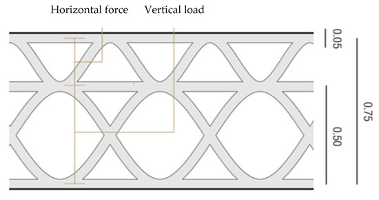 The first case considered is where the wall supports the load of the two larger coverings—i.e., the internal wall between two 12 sqm modules—assuming that the load of the covering is uniformly distributed its length. This structural design is based on the procedure of Paper [30], one of the rare papers that provides design guidance for 3D-printed structures with earthen materials.