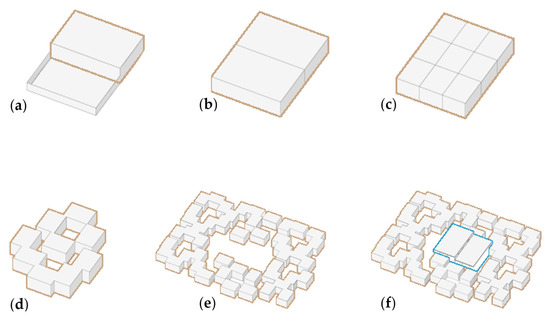 In this project there is a profound shift, in that module definition is essential but the creation of the community is the priority. The module itself exists to define the house and the latter to develop the aggregation. The project focuses on developing a settlement idea that is not limited to the single housing unit [43], which is the private domain of the family, but can be defined as an aggregative system of parts, where we find a constant dialogue between private and common spaces, between the individual and the community. The idea is that the project has to follow the needs of the inhabitants, and adapt. The first assumption is that different rooms require modules with different sizes, both in plan and section. In this way, not only will the space designed satisfy the needs of the inhabitants, but it will also create variations in the settlement. This variation in size also helps to create a hierarchy between the areas designed, where we can clearly read the presence of private spaces, family spaces and community spaces, with different degrees of privacy: