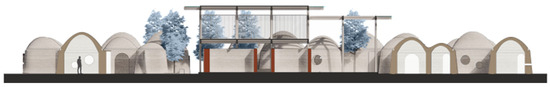 It should be emphasized that the realization of the settlement through 3D printing allows the possibility of customizing functional blocks according to the needs of the inhabitants, opening up new possibilities for participatory design, and adapting the project as best as possible to the needs of the community. Given the extreme flexibility of the construction process, it should be specified that the one shown in Figure 15 is only one possible aggregation of the units, but the same design process could be replicated to define linear, terraced, or block typologies.