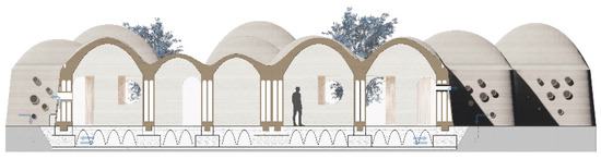 From the elevation (Figure 20) and the section (Figure 21), we can read the elevation configuration of the blocks. The roof-base level is the same for all the units, regardless of size, but the roof height varies with the plan size of the module. This allows for a dual characterization of living spaces, the first characterization being covered—open and the second based on different internal heights. We can also observe the difference in the perforations that open onto the street fronts and those inside: both are designed according to the same principle, that is, to be made directly during the printing phase. However, the former are small and very dense, while the latter are fewer in number and larger in size. Regarding the wall, we see how it is connected in the foundation to channels that allow for ventilation (Figure 22), maintaining proper internal comfort and preventing overheating.