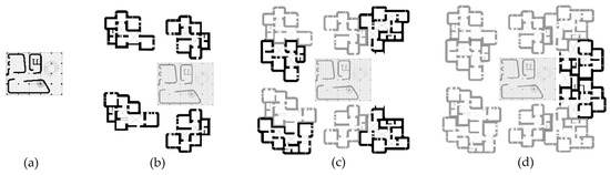 Settlement printing phases: (a) Common spaces; (b) ×4 dwellings; (c) ×8 dwellings; (d) ×10 dwellings.