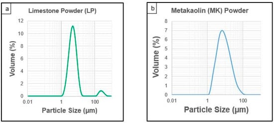 Master sizer particle size analysis of (a) limestone powder and (b) metakaolin powder.