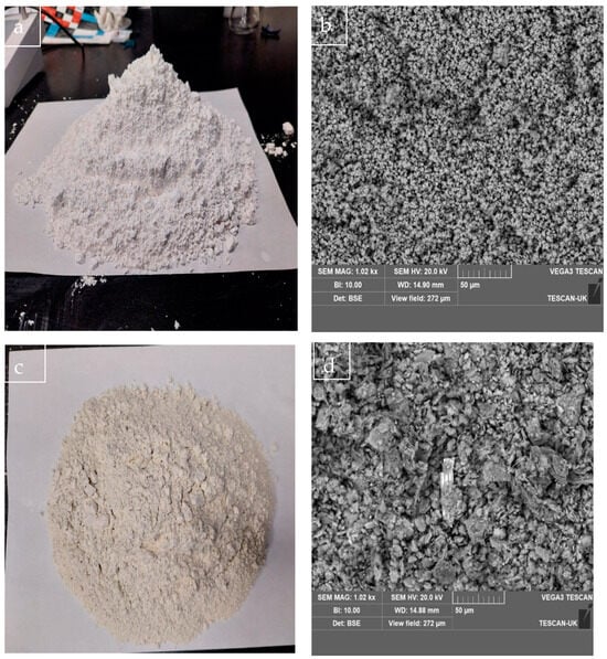 (a,b) Photographic and SEM image of limestone powder. (c,d) Photographic and SEM image of metakaolin powder.