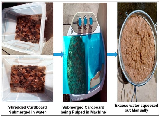 Stationaries and mail stores on the Cranfield University campus provided waste cardboard papers, which served as the main source of waste kraft fibre utilized in this research. To begin with, the waste cardboard papers were shredded manually into smaller pieces with the aid of scissors, while removing all the foreign materials, such as glue and pins, from the shredded pieces. After that, the carton papers were soaked in clean water for 48 h in the laboratory, applying a 5:1 water-to-cardboard weight ratio. Thereafter, the soaked carton papers were continuously pulped for 2 h by gently agitating in water. The pulped carton paper was further pulverized in a blender at a low speed for a further 8–10 min. The product obtained from the blender was manually drained of the water used for the pulping process. The final product was stored in zip bags and refrigerated at 3 ± 1 °C. The weight of the wet kraft pulp fibre divided by the weight of the oven-dried kraft pulp fibre produces a kraft pulp fibre with 70% average moisture content. Figure 3 demonstrates a pictorial representation of the production technique employed for producing the kraft pulp fibre.