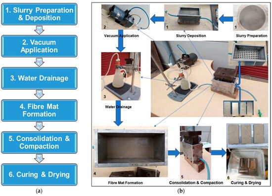 (a) Flowchart for vacuum dewatering process. (b) Laboratory setup for composite production.