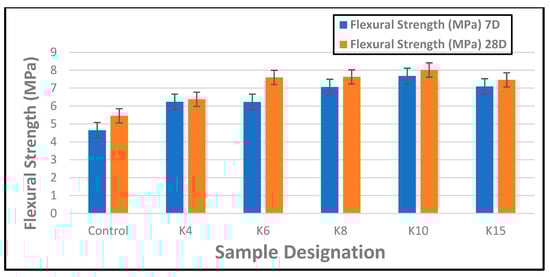 The performance of waste kraft fibre-reinforced cement composite boards in terms of their response to bending load is presented in Figure 5. It was observed that the presence of the waste kraft fibre as reinforcement improved the strength characteristics of the cement board. Hence, all the composite samples containing waste kraft fibre reinforcement had better flexural strength than the control sample both at 7 and 28 days of hydration. The observed characteristic improvement in strength by the addition of the waste kraft fibre as reinforcement can be traced to the fibrous structure of the waste kraft fibre which enables the formation of a mechanical interlock between the fibres and cement matrix. This enhances the bonding at the fibrematrix interface, leading to a more efficient load transfer mechanism within the composite board. Additionally, because cement-based materials are typically weak in tension but strong in compression, the high tensile strength of the waste kraft fibre also improves the tensile strength of the cement composite boards; hence, its resistance to bending or flexural stresses is improved significantly. From the graph, it was observed that an increase in the reinforcement contents led to a steady and consistent increase in the flexural strength of the composite boards up to a maximum of 10 wt.% before a gradual decrease was noticed at 15 wt.% reinforcement contents. A similar observation was reported in the work of Khorami and Ganjian [] when they examined the effect of fibre content on the flexural behavior of cement composite boards. The initial presence of the waste kraft fibre as reinforcement in the 4 wt.% fibre-reinforced cement composite board (K4 sample) produced a 34% and 17% improvement in flexural strength at 7 and 28 days, respectively, compared to the control sample. Overall, the 10 wt.% fibre-reinforced cement composite board (K10 sample) showed the highest flexural strength, with a 65% and 47% improvement in strength compared to the control sample without any fibre addition. A similar result was reported in another research study conducted by the authors [].