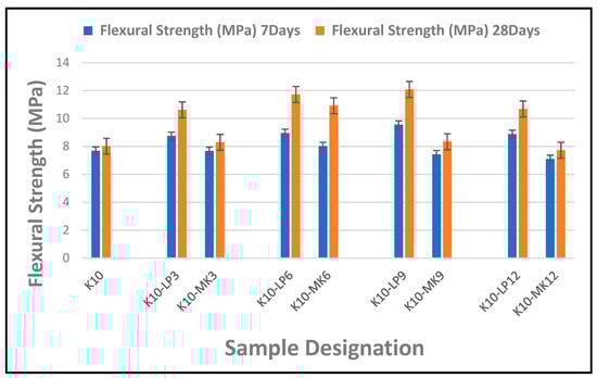 Figure 6 presents the results of composite boards containing 3–12% limestone or metakaolin powder as partial cement replacement in composite samples reinforced by 10 wt.% of waste kraft fibre. It was observed that the inclusion of the limestone powder as a partial cement replacement had a pronounced effect on the flexural strength of the waste kraft fibre-reinforced cement composite board. This could be attributed to the filler effect and the densification of the cementitious matrix as a result of the formation of additional calcium carbonate by the interaction between the particles of the limestone powder and that of the cementitious matrix. Yu et al. [] reported a similar observation in their study on the use of limestone calcined clay for the improvement of tensile performance of high-strength cementitious composites. Furthermore, it was observed that different dosages of the limestone powder addition produce varied effects on the flexural performance of the composite board. Hence, the K10-LP9 composite sample containing 9% limestone powder as a partial cement replacement displayed the best flexural strength, with values of 9.55 and 12.07 MPa, compared to the reference sample, K10, with values of 7.68 and 8.01 MPa, at 7 and 28 days of hydration, respectively (an increase of 24% and 50% for 7 and 28 days of hydration, respectively).