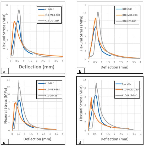 Flexural behaviour of composite boards reinforced by 10 wt.% of waste kraft fibre and (a) 3%, (b) 6%, (c) 9%, and (d) 12% of limestone powder/metakaolin as partial cement replacement (28 days).