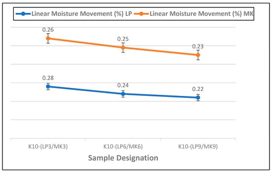 Figure 8 shows the effect of increasing the percentage of metakaolin and limestone powder on the moisture movement characteristics of waste kraft fibre-reinforced cement composite boards. It was observed that increasing the percentage of either metakaolin or limestone powder reduces the ingress of water into the composite board. This is because the incorporation of the metakaolin and limestone powder contributes to a denser and more compact cementitious matrix. This densification leads to a reduction in the size and connectivity of pores and voids within the composite board, thus decreasing its overall permeability to moisture. This could be attributed to the filler effect and the fine particle size of the additives, as well as their pozzolanic reaction, which contributed to the formation of additional hydration products which fill the voids and capillary pores within the cementitious matrix. A similar assertion was reported in the work of Yang et al. [] when they incorporated quarry-stone powders into ultra-high-performance concrete. Hence, the ingress of water into the composite board is minimized, and this helps to prevent and/or reduce the occurrence of issues such as dimensional changes and moisture-related deterioration. Therefore, the composite board containing 9% limestone and metakaolin powder shows the highest resistance to moisture movement, with respective values of 0.22% and 0.23%.