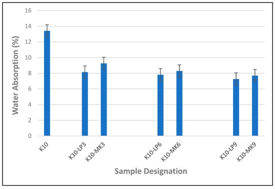 The effect of metakaolin and limestone powder on the water-absorption property of composite boards reinforced with waste kraft fibre is presented in Figure 9. It was observed that the addition of both the metakaolin and limestone powder had a positive influence on the water-absorption property of the cement composite board. This is because the metakaolin and limestone powder particles fill the voids and pores within the composite board, reducing the pathways for water to penetrate the composite boards; hence, the overall water-absorption capacity of the composite board is reduced. From Figure 9, it can be seen that the addition of metakaolin and limestone powder at 3% cement replacement produced a sudden decrease in the water-absorption capacity of the composite board, resulting in a respective 31% and 39% reduction in the volume of water absorbed by the composite board. It was also observed that a further increase in the percentage of metakaolin and limestone powder as partial cement replacement also led to a further decrease in the percentage of water absorbed by the composite board. Hence, the composite board containing 9% metakaolin and limestone powder as partial cement replacement displayed the optimum results by absorbing the least volume of water with a value of 7.69% and 7.25%, respectively, resulting in a 43% and 46% enhancement in the water-resistance capacity of the composite boards, respectively, when compared to the reference sample, K10. From the foregoing, by comparing the impact of metakaolin and limestone powder on the water-absorption property of the cement composite board, it was noted that the presence of limestone powder as a partial cement replacement offered a higher resistance to water absorption than its counterpart containing metakaolin powder. This result agreed with the previous result discussed in Figure 8.