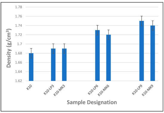Figure 10 shows the impact of the addition of metakaolin and limestone powder as partial cement replacement on the density of cement composite boards reinforced with waste kraft fibre. It was observed that adding metakaolin and limestone powder increased the density of the composite boards. This is primarily due to the improved particle packing caused by the metakaolin and limestone powder particles interacting with the cement particles in the composite mixture. This improved particle parking contributes to a denser microstructure, hence increasing the overall density of the composite board. From Figure 10, it is observed that incorporating 3% metakaolin and limestone powder as a partial cement replacement in the waste kraft fibre-reinforced cement composite board produced a slight but equal increase in the density of the composite board. Increasing the percentage of metakaolin and limestone powder to 6% produced a subsequent increase in the density of the composite board, resulting in a 2.4% and 3% increase, respectively. The composite board containing 9% metakaolin and limestone powder as a partial cement replacement displayed the maximum density, with a value of 1.74 and 1.75 g/cm3, respectively. This culminated in an overall increase of 3.6% and 4.2%, respectively, compared to the reference sample, K10. Consequently, by comparing the impact of adding metakaolin and limestone powder as a partial cement replacement on the density of waste kraft fibre-reinforced cement composite board, it was noted that limestone powder had a slightly higher influence on the density of the composite board than its counterpart containing metakaolin powder. This could be due to the finer particle size of the limestone powder as compared to that of the metakaolin.