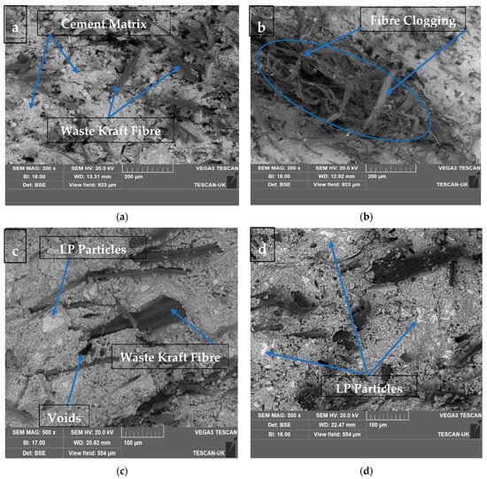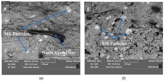 Figure 11a,b show the SEM morphology of the fractured surfaces of 10 wt.% and 15 wt.% waste kraft fibre-reinforced cement composite boards. It was observed that the composite board reinforced with 10 wt.% waste kraft fibre displayed homogeneity and uniform fibre distribution; this culminated in the high strength observed in the composite sample. On the other hand, in the composite board reinforced with 15 wt.% waste kraft fibre, there was a significant occurrence of fibre clogging and/or clumping which was primarily due to the presence of the excess fibre in the composite board. Hence, the flexural strength of the composite sample decreased gradually as a result of the formation of a weak point within the composite (shown and explained earlier in Figure 5). From Figure 11c,d, it was observed that the addition of the limestone powder as a partial cement replacement fulfills its role as an inert additive by filling the voids and capillary pores within the composite boards, thereby contributing to and increasing the densification and the particle parking within the composite. Hence, the flexural strength of the composite boards improved, as noted previously, in Figure 6. In the same vein, in Figure 11e,f, the addition of the metakaolin as a partial cement replacement also fulfilled its role as a pozzolanic material and a filler. It was observed that the composite board containing 6% metakaolin as a partial cement replacement showed a refined microstructure when compared to that of Figure 11a. This is due to the presence of the metakaolin, which forms additional calcium silicate hydrate gel through the pozzolanic reaction with the calcium hydroxide produced during the cement hydration process. This additional calcium silicate hydrate gel and the refined microstructure contribute to the densification and, hence, the overall strength of the composite board. This evidence agreed with the submissions of other researchers [,].