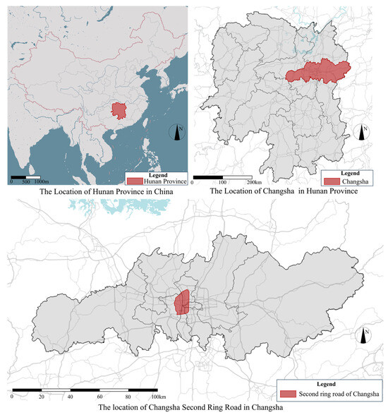 Changsha (111°53′–114°15′ E and 27°51′–28°41′ N) is a metropolitan city located in the central–south part of China; it has a subtropical monsoon climate and is remote from the sea. According to the Köppen–Geiger climate classification, which was updated by Beck et al. (2018), Changsha is located in a Cfa zone. The main characteristic feature is temperature. There is no dry season, and the summer is hot [32]. The Chinese Uniform Standard for the Design of Civil Buildings (GB50352-2019) divides the different areas of China into seven building climate zones. Changsha is located in the hot summer–cold winter zone [33]. Figure 1 shows the geographical location of Changsha, as well as the main study area, i.e., the area within the second ring road. The location of the study area was marked by us based on the maps downloaded from Guihuayun [34]. The area within the second ring road of Changsha has a large number of skyscrapers and is quite representative of a Chinese metropolitan city. In 2023, the total permanent population of the city was 10.5131 million people [35,36]. The terrain of the city is like a funnel that opens northward. In the summer, the southeast monsoon cannot penetrate the city well. Meanwhile, in the winter, the northwest monsoon can accumulate southward. Therefore, Changsha is hotter in summer and slightly colder in winter than many other cities in the same latitude area [35].