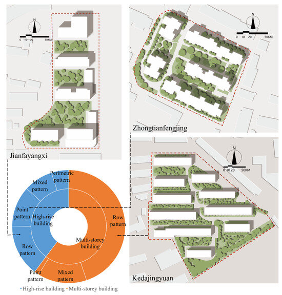 The residential area layout characteristics in China have undergone three main periods of change. The first stage was from 1949 to 1978. During this time, structuralism and functionalism were prevalent, and the layouts of residential areas were primarily characterized by row patterns and enclosed patterns. The second stage of change occurred from the 1980s to the end of the 20th century. During this time, humanism was advocated for, and the layouts of residential areas were mainly characterized by row patterns. The third stage of change occurred after the turn of the 21st century. Here, the predominant architectural ideology was ecologism. The layouts of residential areas have more combination forms, including point, row, perimetric, and mixed patterns [53]. Furthermore, Luo (2022) divided high-rise residential building layouts in Changsha into three types, namely the slab pattern, the point pattern, and the slab–point pattern [54].