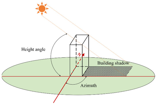 During the day, buildings can cast shadowed areas that are not illuminated by sunlight (as shown in Figure 5). According to the motion law of the sun, different sun altitude angles and sun azimuth angles will form different building shadows at different times of the day. For example, on the summer solstice at a local time of 12:00 noon, the sun reaches its peak, the sun’s altitude angle is the largest, and the shadowed area cast by the building is the smallest. Therefore, the impact of building shadows on the outdoor thermal environment can be considered and analyzed during different time periods.
