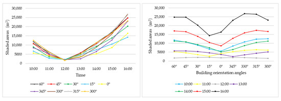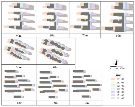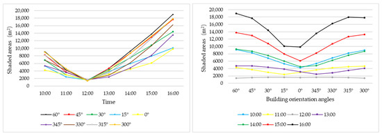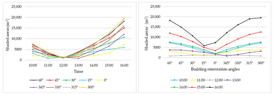Figure 9 shows that, at 12:00 noon, the building-shadow areas of the multistory row-pattern buildings, with different building orientation angles, show few differences. At 10:00, 14:00, and 15:00, the shadow areas shown in the model with a building orientation angle of 0° are the smallest. At 11:00 and 16:00, the shadow areas of the buildings with a building orientation angle of 15° are the smallest. At 13:00, the shadow areas of buildings with a building orientation angle of 15° are the smallest.