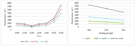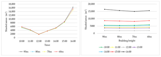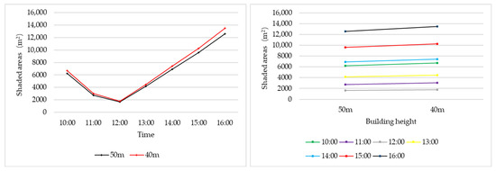 Figure 14 and Figure 15 show the change in building shadows in Jianfayangxi and Zhongtianfengjing, respectively. During the study setup, in order to ensure that the floor-area ratio remains unchanged, we reduced the building height while also increasing the base area of the building. There are two variables in the study setup that can change the shadow area of the building. These results did not show a simple decrease in the area of shadow with the decrease in building height. In Jianfayangxi, the comparison results for the building-shadow areas show the following order: 90 m buildings > 60 m buildings > 80 m buildings > 70 m buildings. In the high-rise row pattern, the influence of building height on building shadow is more substantial compared to the building base area. In the Zhongtianfengjing prototype, the comparison results for the shadow areas show the following order: 40 m buildings > 50 m buildings. The influence of the building base area on the building shadow is greater than the influence of the building height in the small high-rise point-pattern buildings. However, regardless of the height of the buildings, the overall trend of the change in the shadow area remains as follows: the shadow area gradually decreases from 10:00 a.m. to 12:00 noon, gradually increases from 12:00 noon to 16:00 p.m., and is the smallest at 12:00 noon.
