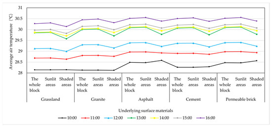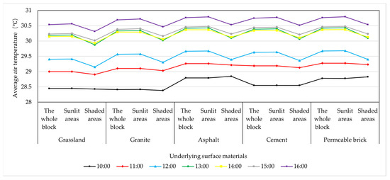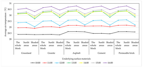 Figure 20, Figure 21 and Figure 22 show the average air temperature of the sun-lit area, the shadow area, and the whole study area under the different conditions of various underlying materials in the Jianfayangxi, Zhongtianfengjing, and Kedajingyuan prototypes. The results show that, regardless of the building layout, the overall average temperatures within the blocks show the same trend of change at 10:00, with asphalt > permeable bricks > cement > grassland > granite. From 11:00 to 16:00, the trend is as follows: permeable bricks > asphalt > cement > granite > grassland. The average temperature-change trend in the sun-lit area and the average temperature-change trend in the shadow area are the same as the overall temperature change in the whole study area. This indicates that, among the common underlying materials in residential areas, soft underlying surfaces (such as grass) can have a lower temperature than the hard underlying surfaces. Meanwhile, among the hard underlying materials, granite has the lowest temperature.