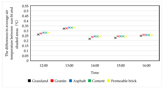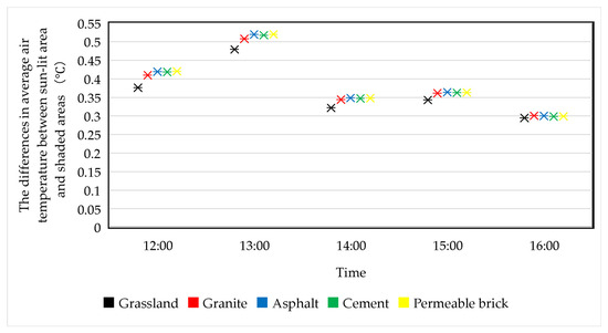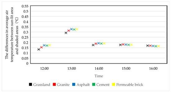 The average air temperature differences between the sun-lit and shaded areas in Zhongtianfengjing were within the range of 0.25–0.55 °C from 12:00 to 16:00 (Figure 24). From 12:00 to 16:00, the differences in air temperature between the sun-lit and shaded areas of grassland were the smallest among the five underlying materials. From 12:00 to 14:00, the differences in the values between the sun-lit and shadow areas of granite were greater than those of grassland and smaller than those of the other three underlying materials. The differences in the values between the sun-lit and shadow areas of asphalt, cement, and permeable bricks were similar. From 15:00 to 16:00, with the exception of grassland, the other four types of underlying materials had similar numerical differences in air temperature between the sun-lit and shaded areas. This indicates that the shadows had the smallest impact on air-temperature reduction for grasslands, followed by granite. The influence of shadows on air temperature is more evident when the underlying materials are asphalt, cement, and permeable bricks.