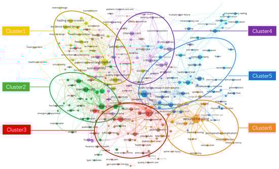 Cluster 6 (orange) contains “wound healing” as the core term, with keywords such as “pressure ulcer”, “wound care”, “telemedicine”, “postoperative complications”, and “wound infection”. The presence of the keyword “wound healing” is both unexpected and justified. Wound healing and HTD are interconnected in promoting patient recovery and comfort in healthcare environments. Studies have focused on how to accelerate wound recovery through various therapeutic means and whether the level of wound healing is good at different sites, whether it is delayed or not, and the environment; further, randomized controlled trials have been conducted to determine optimal healing methods [55,56,57].