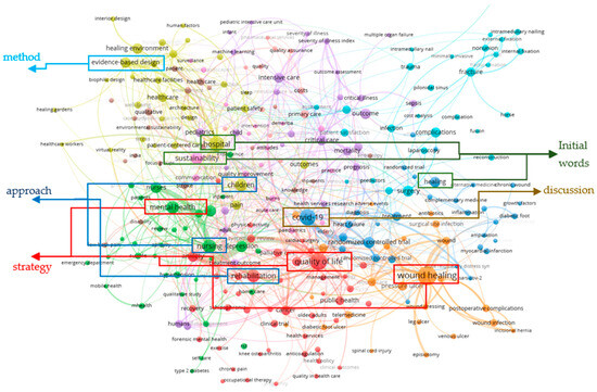 Cluster 5 (blue) is related to “COVID-19”, and “healing”, “surgery”, “treatment”, “randomised controlled trial”, “fracture”, and “infection” are associated. COVID-19 is highly contagious and resulted in a pandemic that involved large numbers of infected people who traveled to hospitals or medical isolation sites for treatment. During this period, multiple studies were produced with the aim of improving cure rates. For example, the risk of infection was reduced by designing resilient hospitals, improving the layout of hospital buildings, and altering patient pathways [52,53]. Research also looked into designing outdoor spaces, such as gardens and green spaces, to provide resting places for healthcare workers to alleviate work stress and anxiety [11,54].
