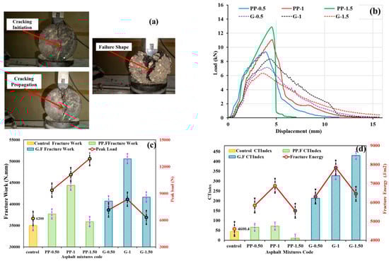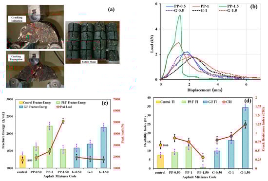 - The addition of G.Fs significantly augmented the crack resistance of bituminous mixtures, over both the control and PP.F mixtures. The G-1.5 mixture achieved the highest CRI values, increasing by 87.9% over the control, while the PP-0.5 mixture in the PP.F group observed a 30.3% increase. However, increasing PP.F dosage by more than 1% reduced CRI values below the control, indicating reduced crack resistance and increased brittleness in PP.F mixtures.