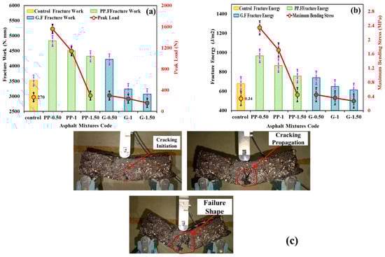 - The results showed that both PP.Fs and GFs significantly affected the fracture behavior and mechanical properties of bituminous mixtures. Comparing and testing various specimen geometries in SCB, IDEAL-CT, and 3-PB tests highlighted how these fibers influence the fracture characteristics of the asphalt mixture.