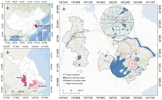 This study focused on nine selected gardens that served as key representatives of the Jiangnan style (Pavilion of Surging Waves, Presidential Palace, Lion Grove Garden, Retreat & Reflection Garden, Humble Administrator’s Garden, Garden of Cultivation, Lingering Garden, Jichang Garden, and Master-of-Nets Garden, Figure 1). The criteria and rationale behind the selection of these six gardens were as follows [,,].