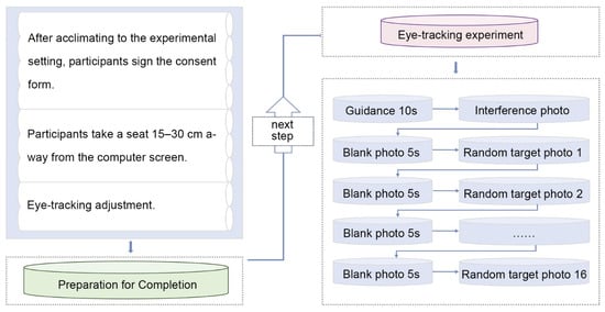 We carried out a particular scene-based visual and psychological cognition experiment to examine the visual preferences and variations in the various buildings in Jiangnan gardens. The participants in the eye-tracking trials were free to view whatever they wanted and could adjust the length of the observation. In order to mitigate any biases resulting from a fixed order, a relaxed experimental environment was created by randomly presenting the photos [,]. The area was meticulously managed to guarantee that ambient noise and lights were strictly regulated. Three calibration points were used to assure accurate eye-tracking readings over the whole screen, and before testing, all participants received the same instructions (training and experimental operation guidelines). Using a computer and an independent eye-tracking equipment, the participants in the experiment examined several garden buildings that were recorded (Figure 2).