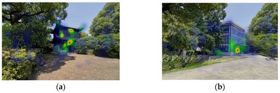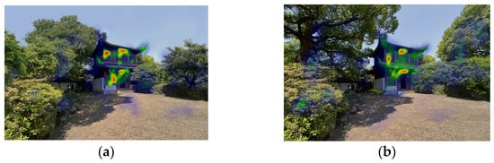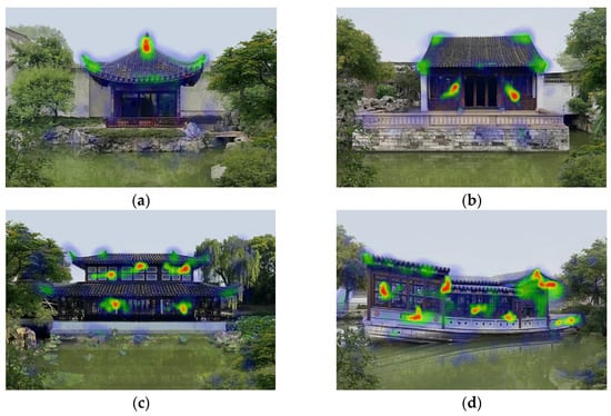 By comparison with the heat map of the actual garden building, we found that the simpler the shape of the building (pavilion and pavilion with building), the heat map is closer to the physical map. For example, the heat map of the shape of the pavilion still focuses on the overall shape. As the shape of the building combines from simple to complex shapes, the visitor’s vision begins to be dispersed on the overall outline of the building [,].