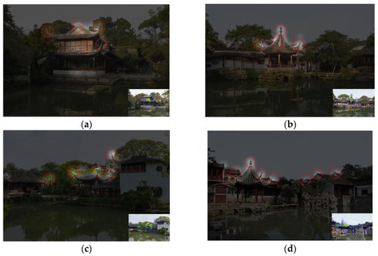 We set up several sets of experimental scenarios under the more distant regions, each with a different number of buildings and increasing building shapes from simple to complex. The experimental scenarios included: a single building (e.g., a single pavilion with building); a combination of two buildings (e.g., a pavilion and a corridor); a combination of three buildings (e.g., a pavilion, a hall, and a pavilion with building), and a combination of multiple buildings (e.g., a pavilion, a hall, a pavilion with building, and a boat-form pavilion). In the experiment, the participants’ visual tracking in different combinations of environments were recorded by the eye tracker and heat maps were generated to analyze the effects of multiple building combinations on visitors’ visual attraction (Figure 7). The experimental results are as follows (Table S7).