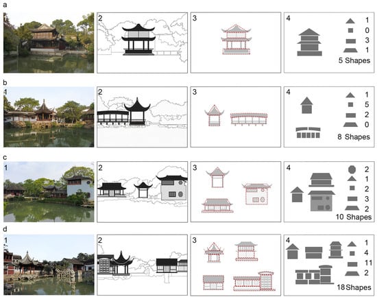 Shape analysis of various garden building combinations: (a1–d1) real-life image; (a2–d2) sketch; (a3–d3) optimized image; (a4–d4) analysis image.