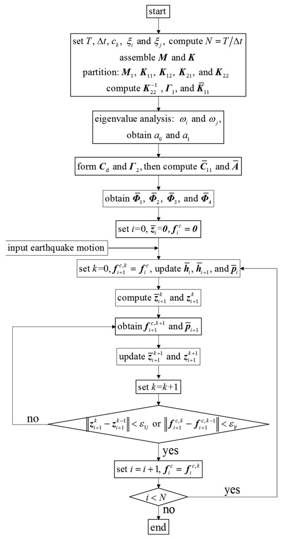 - Step 1: set the total time T, time interval , damping coefficient ck of LVDs, and damping ratio coefficients and of the ith and jth modes, respectively. Assemble the structural mass M and initial stiffness K. Form sub-matrices M1, K11, K12, K12, and K22. Compute , , and .