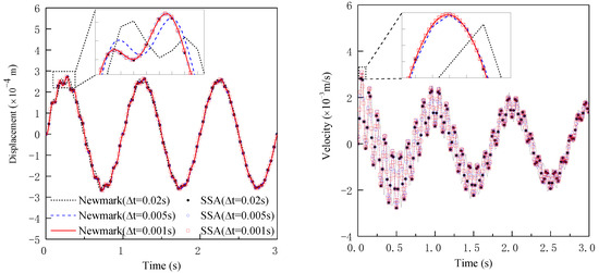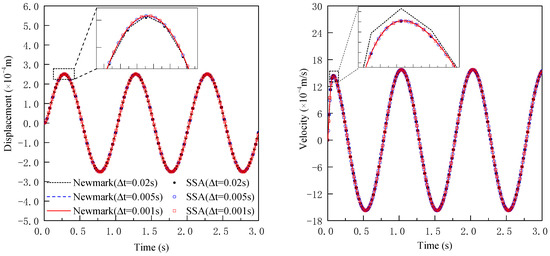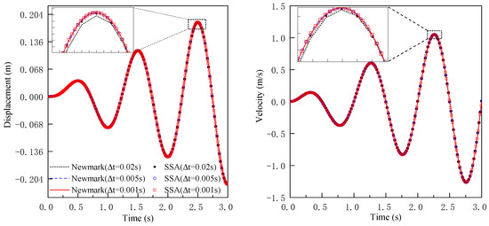 To assess the accuracy of the SSA, the SDOF system under a sinusoidal load was also analyzed using the conventional constant average acceleration Newmark method. Two scenarios were considered for the damping ratio ξ: 0.01 and 1, and the period T was adjusted to 0.1 and 1 s, respectively. The displacement and velocity responses of the SDOF system obtained from both methods were compared and are presented in Figure 3, Figure 4 and Figure 5. The comparison reveals that for SDOF systems with low damping ratios and small periods (or high stiffness), the predictions obtained by the conventional Newmark method are highly sensitive to the time step used. Accurate results that closely match those from the SSA require using an extremely small time step. In contrast, predictions from the SSA are minimally influenced by the time step, demonstrating superior accuracy under these conditions. These findings provide compelling evidence that the SSA surpasses the conventional Newmark method in accuracy, especially for dynamic systems characterized by low damping ratios and high stiffness.