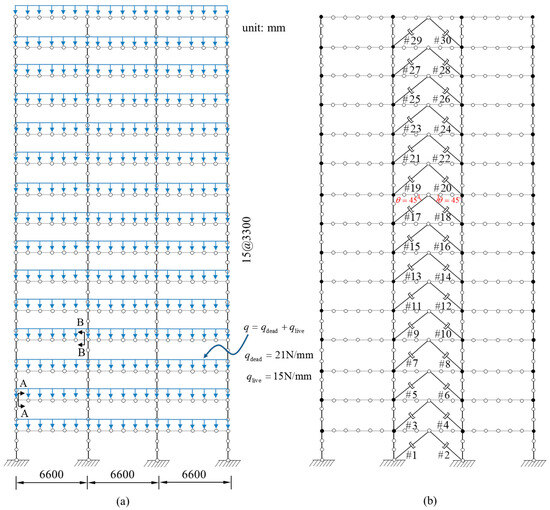 The geometry, load pattern, I-shaped section dimensions, and material model of the 15-storey 3-bay plane steel frame are provided in references [8,29]. Each beam in the frame, shown in Figure 6a, was discretized using 6 displacement-based Euler–Bernoulli beam (DEBE) elements with distributed plasticity, while each column was modeled using 3 DEBE elements. Five Gauss–Legendre integration points were employed in each DEBE element, and the force–deformation relationship at each point was determined using a fiber section model. The I-shaped sections were discretized into 4 layers (i.e., fibers) for the flange and 10 layers (i.e., fibers) for the web. The stress–strain relationship of each discrete fiber followed the uniaxial bilinear constitutive model, incorporating parameters such as Young’s modulus (E), yield strength (fy), and strain hardening ratio (b). Nodal translational masses were assigned only at the beam–column connections, indicated by black solid circles in Figure 6a. The FE model of the 15-storey frame consisted of 409 nodes and 450 frame elements. All bottom nodes were fully fixed in translational and rotational degrees of freedom (DOFs), resulting in a total of 1215 DOFs for the FE model. The first five periods and circular frequencies of the model are provided in Table 1.