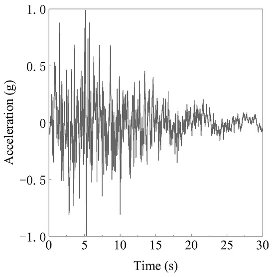 Prior to conducting transient simulations, a gravity analysis was performed on the structure. The gravity load comprised a dead load of 21 N/mm and a live load of 15 N/mm, as depicted in Figure 6a. Convergence criteria were set with a tolerance of 1.0 × 10−5 mm on the norm of the incremental displacement. For the transient analysis, damping coefficients ξ1 and ξ2 were set to 0.2557 and 0.0073, respectively, to achieve a damping ratio of 5% for the first and second modes. The input load for analysis was the 1940 El-Centro wave (see Figure 7). The duration and the time step used for the analysis were 30 s and 0.02 s, respectively.