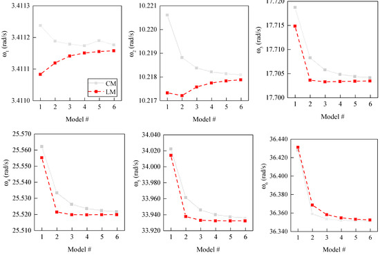 Finally, the computational results of the four mass matrices are compared in Table 5. When using the consistent element mass matrix, the dimensions of the structural mass matrix M and the transition matrix A are 1215 × 1215 and 2430 × 2430, respectively. In contrast, the effective structural mass matrix M1 and the corresponding transition matrix are significantly reduced when employing the lumped element mass matrix. In the three LM matrices, the dimensions of the effective structural mass matrix M1 are 810, 120, and 30, respectively, resulting in the transition matrices ’s dimensionalities of 1620, 240, and 60, respectively. Theoretically, the computational time per iteration is expected to decrease when the size of the transition matrix becomes smaller. However, in this particular example, the computational efficiency benefits of lumped element mass matrices are not evident due to the relatively small number of DOFs in the plane frame.