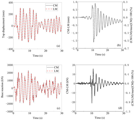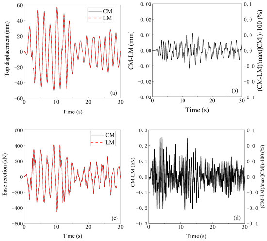 In this section, the impact of mass distribution on accuracy and efficiency was examined. This section considered four different mass matrices: (1) CM, (2) lumped masses assigned at each nodal translational DOF (LM1), (3) lumped masses assigned at each beam–column joint nodal translational DOF (LM2), and (4) lumped masses assigned at the translational DOF of the mid-node in each floor (LM3). In the three LM matrices, nodal rotational inertias were neglected, while the total structural masses were kept consistent. Table 4 presents the computational results obtained using the I-SSA with these four different mass matrices. The CM matrix represents the most theoretically rigorous choice, and its numerical results are considered as the accurate benchmark. It is evident from Table 4 that the simulation predictions using the three lumped mass matrices (i.e., LM1, LM2, and LM3) are highly consistent with those obtained from the CM matrix. It indicates that the seismic response of the frame FE model is not significantly influenced by the specific mass matrix employed in this example.