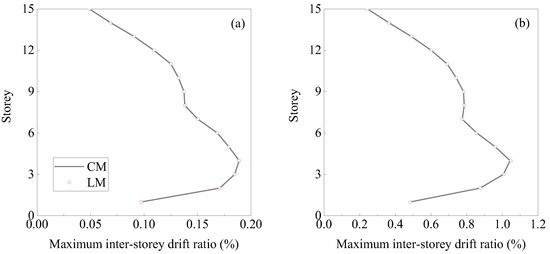 Maximum IDR envelopes of the 15-storey frame using the two mass matrices: (a) PGA = 70 Gal, (b) PGA = 400 Gal.