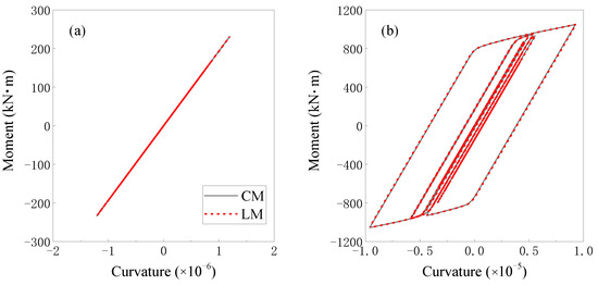 Comparisons of moment–curvature curves of section A-A using the CM and LM matrices: (a) PGA = 70 Gal, (b) PGA = 400 Gal.
