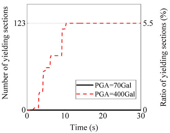 Number and ratio of yielding elements time history curves under the three loading cases.