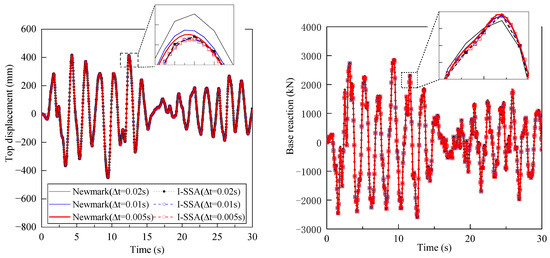 Top displacement and base reaction time history curves of the plane frame obtained from the Newmark and I-SSA using three different time steps.