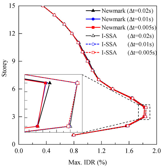 Maximum IDR envelopes of the 15-storey frame predicted by the Newmark and I-SSA using three different time steps.