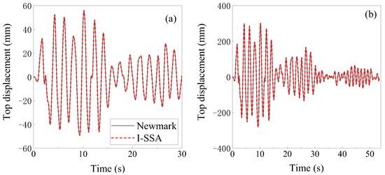 Top displacement time history curves of the frame equipped with LVDs obtained from the Newmark and I-SSA: (a) PGA = 70 Gal, (b) PGA = 400 Gal.